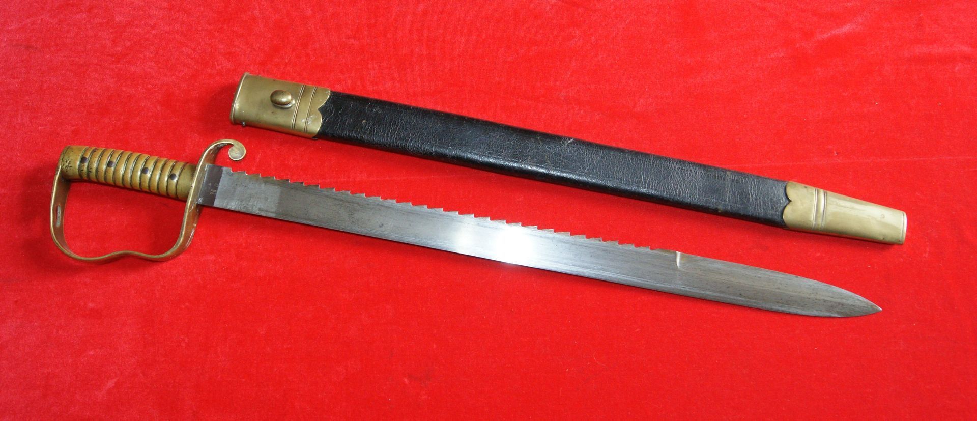 This is a good example of a scarce Royal Navy marked P1856 Sawback Sword complete with original brass mounted black leather scabbard.
